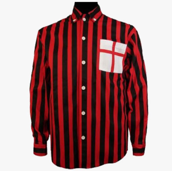 最初版本的米兰队服采用的是较为细长的红黑条纹,我们还可以看到球衣左侧胸前有一个大大的白底红十字图案,这么做并不是因为创立俱乐部的是两个英格兰人,尽管与象征英格兰的圣乔治十字几乎一模一样,但它的名字其实是“圣安布罗斯十字”,是米兰城自古以来的标志之一,用以向公元四世纪那位伟大的主教致敬。时至今日,如果你发现哪一年米兰球衣上的红黑间条突然变得窄而密集,或是球衣上的队徽换成了单独的十字标志,那多半是在向这款元年的经典致敬了。