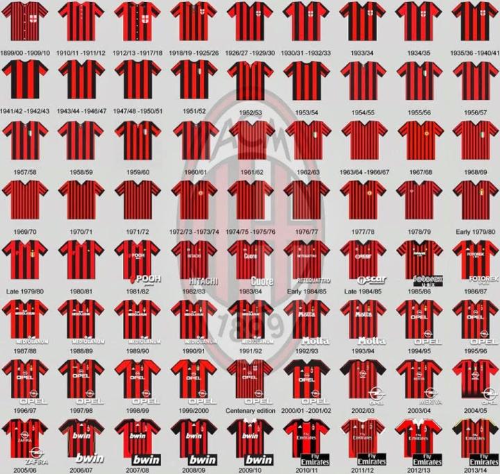 在遵循传统的道路上越走越远,也会出现一些令人尴尬的事情。譬如,如果把米兰建队前90年的各件球衣摆在一起,给人的感觉就像是在玩一款究极版的大家来找茬。