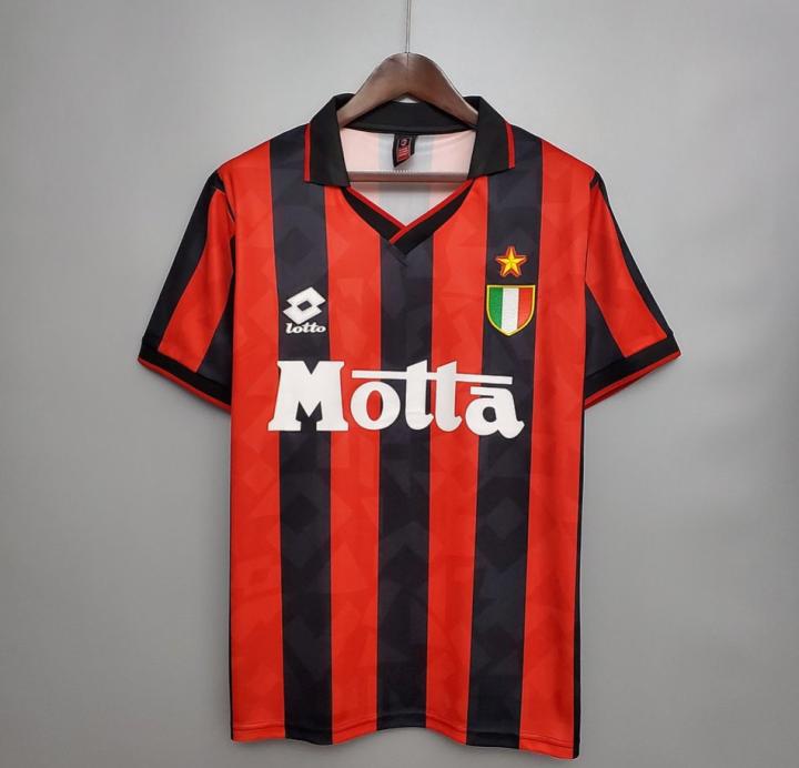 米兰93/94赛季主客场球衣,当时依然是没有队徽的版本,胸前广告是来自意大利的莫塔咖啡