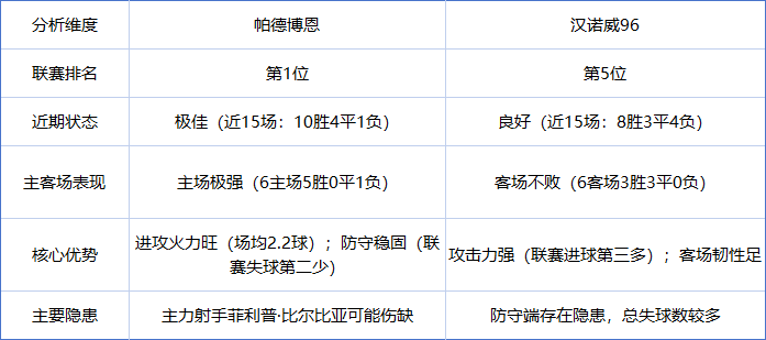 总而言之,帕德博恩在纸面实力和主场优势上稍占上风,但汉诺威96的客场韧性让比赛充满悬念。比尔的缺阵情况将是影响战局的关键变量。