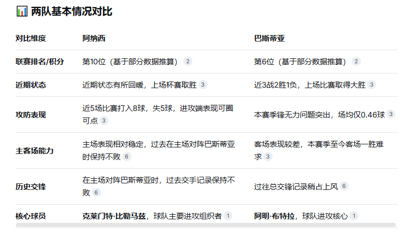 状态延续与反转:阿纳西近期进攻端表现不错,近5场累计打入8球。而巴斯蒂亚虽然上场比赛取得大胜,但其本赛季进攻效率不高,且客场防守存在隐患。