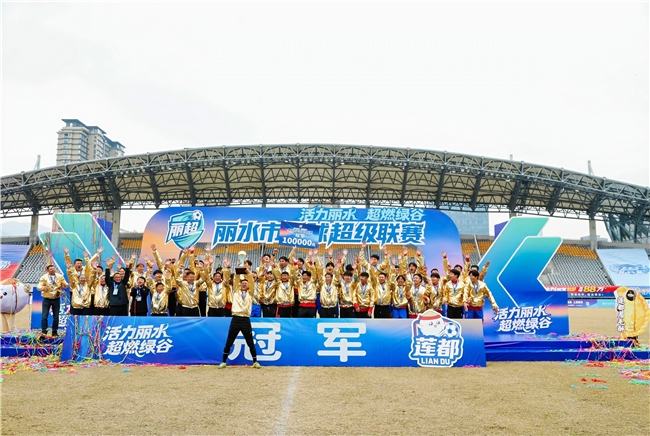 当莲都队球员们身着金色冠军服围在一起,象征丽水市足球超级联赛冠军的奖杯被郑重地、缓缓托起,瞬间,无数手臂森林般高举、欢呼——这幅名为“冠军”的画面,被永恒定格。