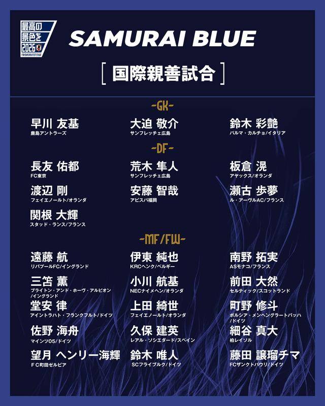 8月28日,日本足协公布了9月国际友谊赛的日本队25人大名单。远藤航、三苫薰、久保建英等重要球员入选。