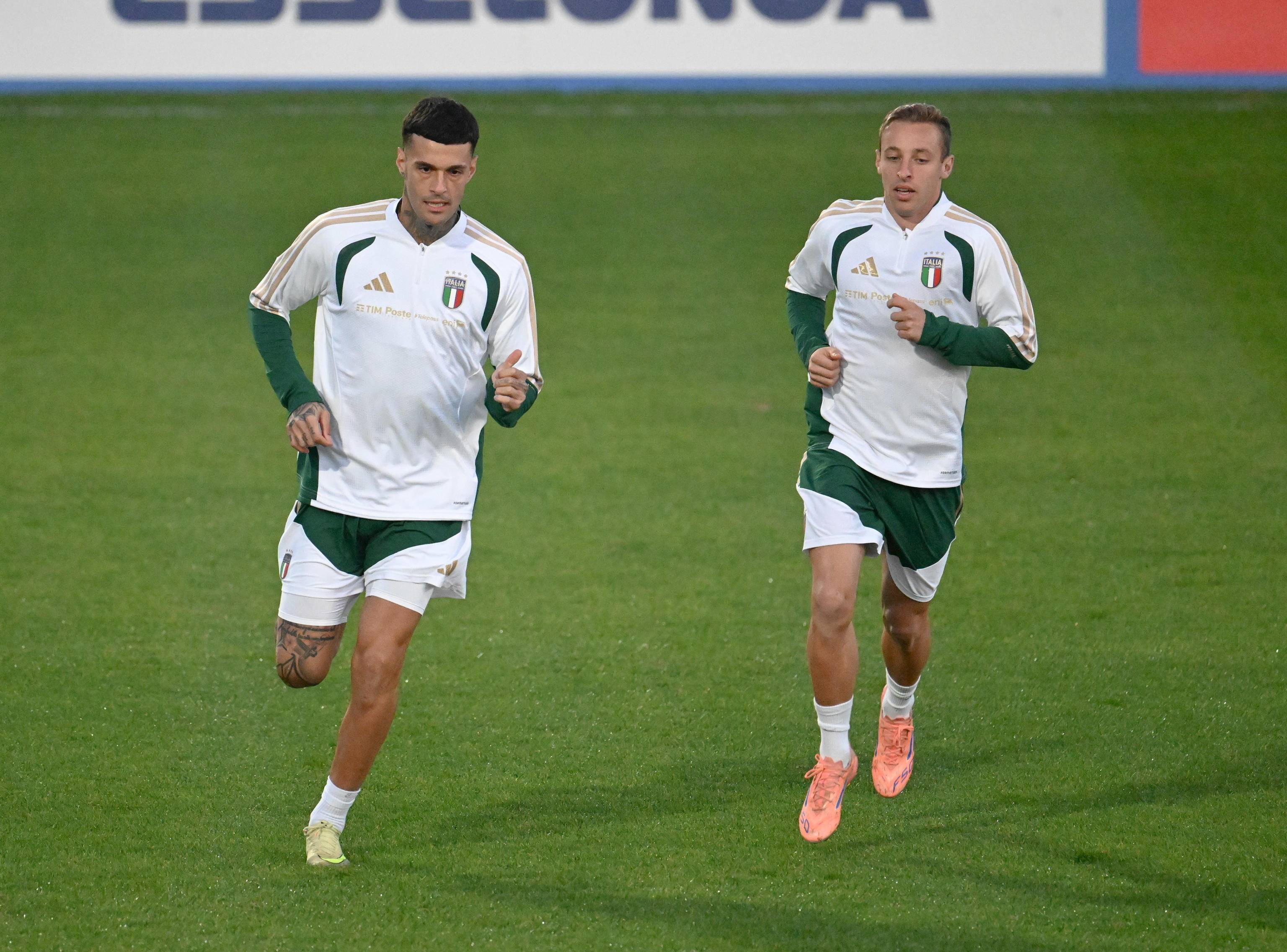 11月10日,意大利队球员弗拉泰西(右)和斯卡马卡在训练中。 新华社/欧新