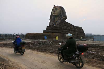 3月3日,安徽省滁州市,两名骑着摩托车下班的工人从山寨版身人面像前经过。位于安徽滁州的长城国际动漫旅游创意园二期工程正在加紧建设,一处基本完工的“人面狮身”雕像吸引人们的目光。据悉,该狮身人面像是以埃及的狮身人面像为原型,按照1:1比例打造而成。